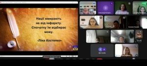На бібліотечному уроці разом з вчителем української мови і літератури Кіріченко Е.О. , завідувачкою бібліотеки ліцею Пятих О.І. учні 8-а класу критично мислили над словами Ліни Костенко « Нації вмирають не від інфаркту. Спочатку їм відбирає мову.»